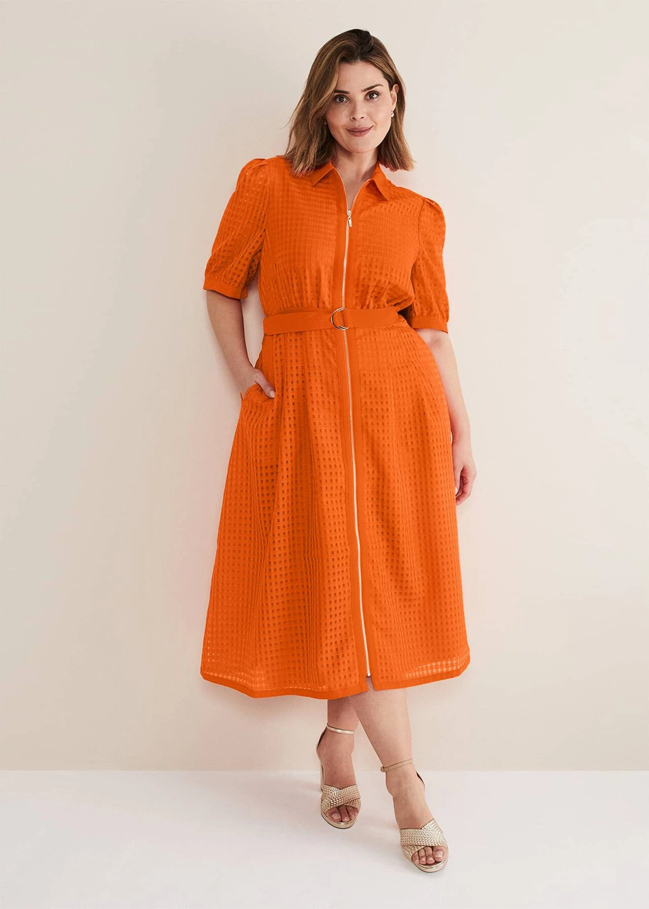 Carey Orange Checked Textured Midi Dress