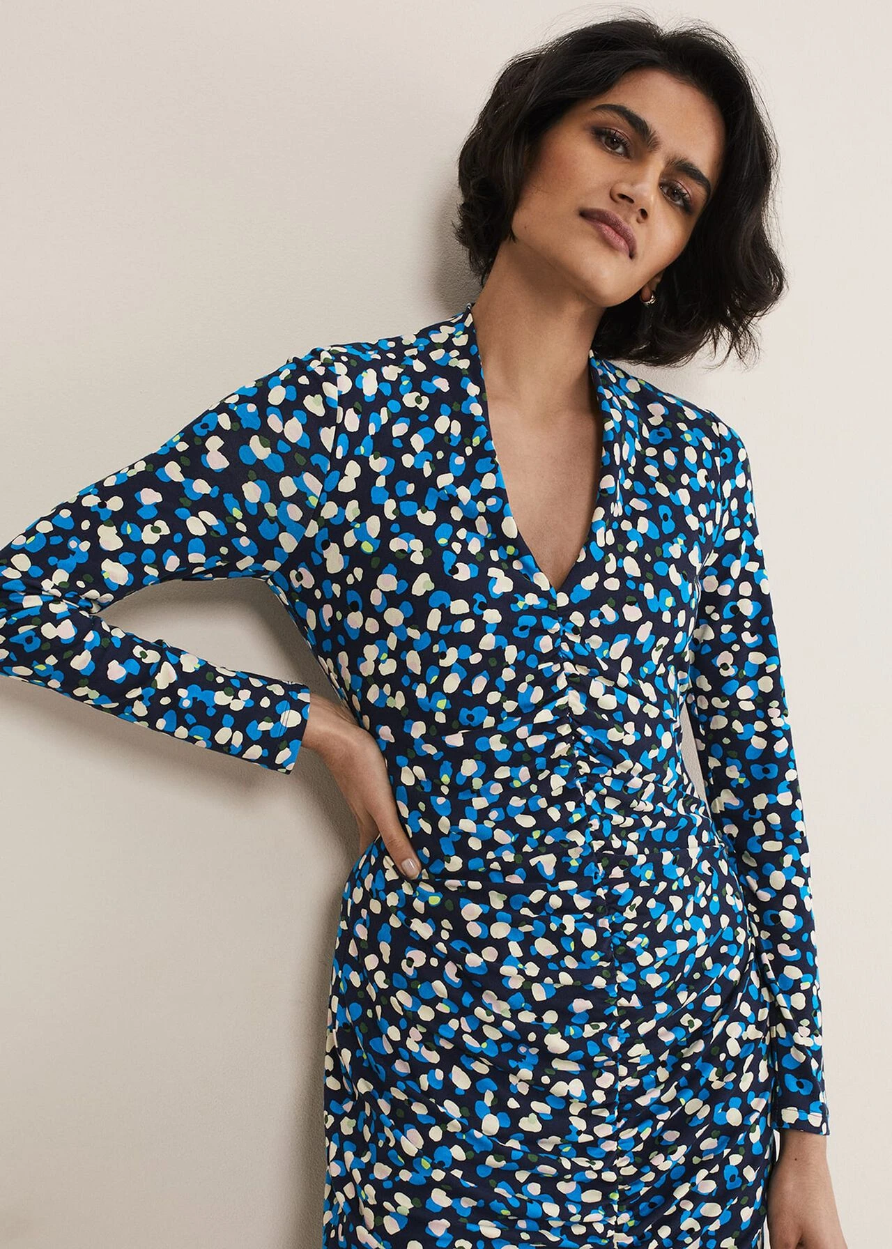 Juno Ruched V Neck Dotty Bodycon Dress